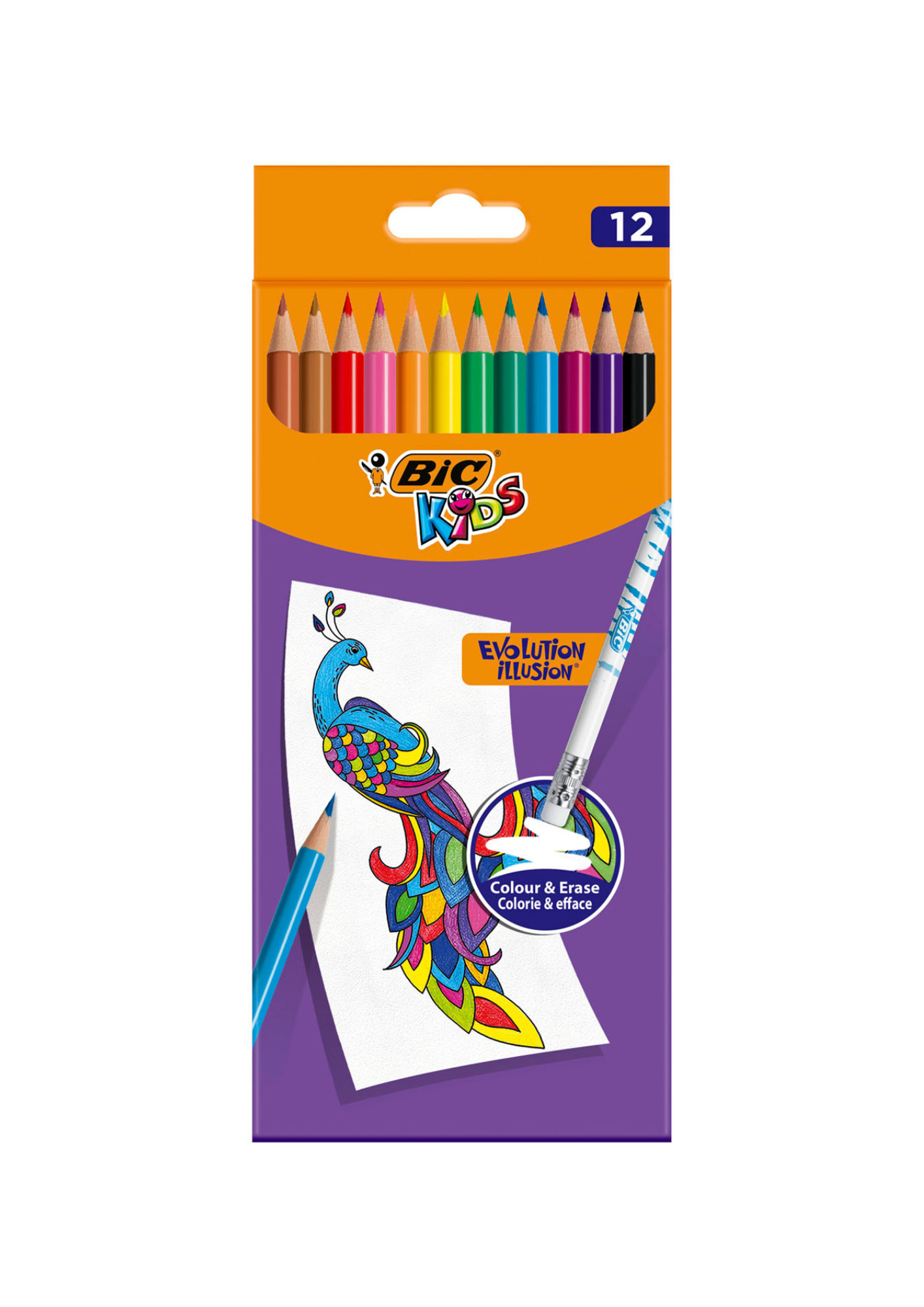 BIC Pochette de 12 Crayons de couleur Kids Evolution Illusion, effaçable bout gomme